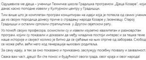 Да је програм успио и да је дирнуо срца бројне публике говоре и коментари на друштвеним мрежама међу којима се издваја коментар доктора Радоја Рацановића на друштвеној мрежи Фејсбук. Програм су припремале Борислава Цвијић (координатор, текстови), Мира Чекић (хор, етно група, рецитације), Јована Малетић (рецитације, сценографија), Свјетлана Видовић и Недељка Јотановић, професорици српског језика и књижевности, Слободанка Ђурић професор математике, Синиша Вујичић и Срђан Ђукановић (техничка припрема), професори стручних предмета.